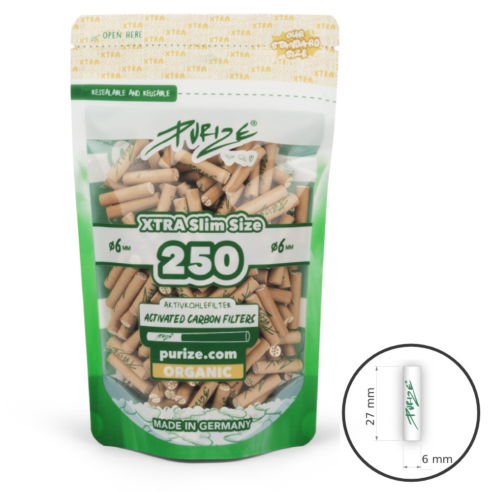 Purize Xtra Slim Organic aktyviosios anglies filtrai. Pakelyje 250 vnt. 6 mm diametro filtriukų.