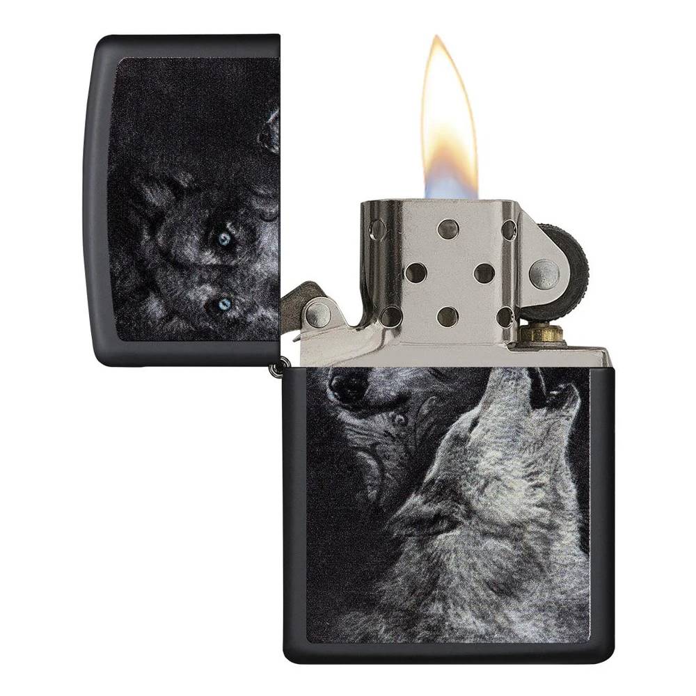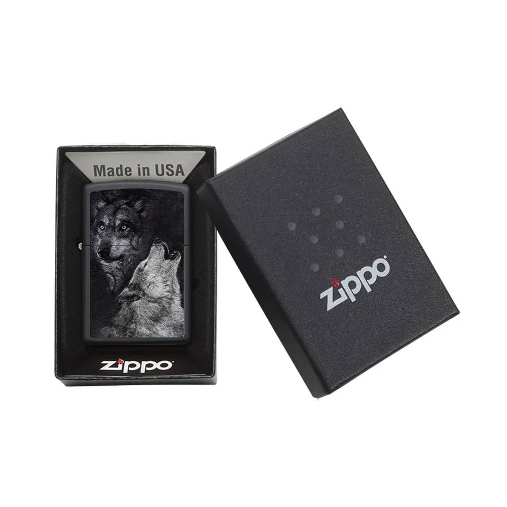 Zippo Wolf žiebtuvėlis yra pavaizduotais dvejais vilkais. Svarbu: Zippo Žiebtuvėliui pildyti turėtų būti naudojami tik originalūs komponentai t.y. Zippo kurasZippo akmenėliai ir Zippo knatas.